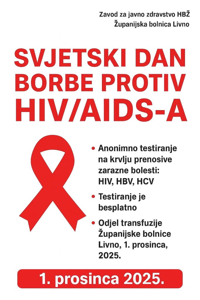 Svi građani su pozvani na dragovoljno, povjerljivo, anonimno i besplatno testiranje koje će se održati na Odjelu transfuzije u ŽB Livno, u periodu od 11h do 14h.